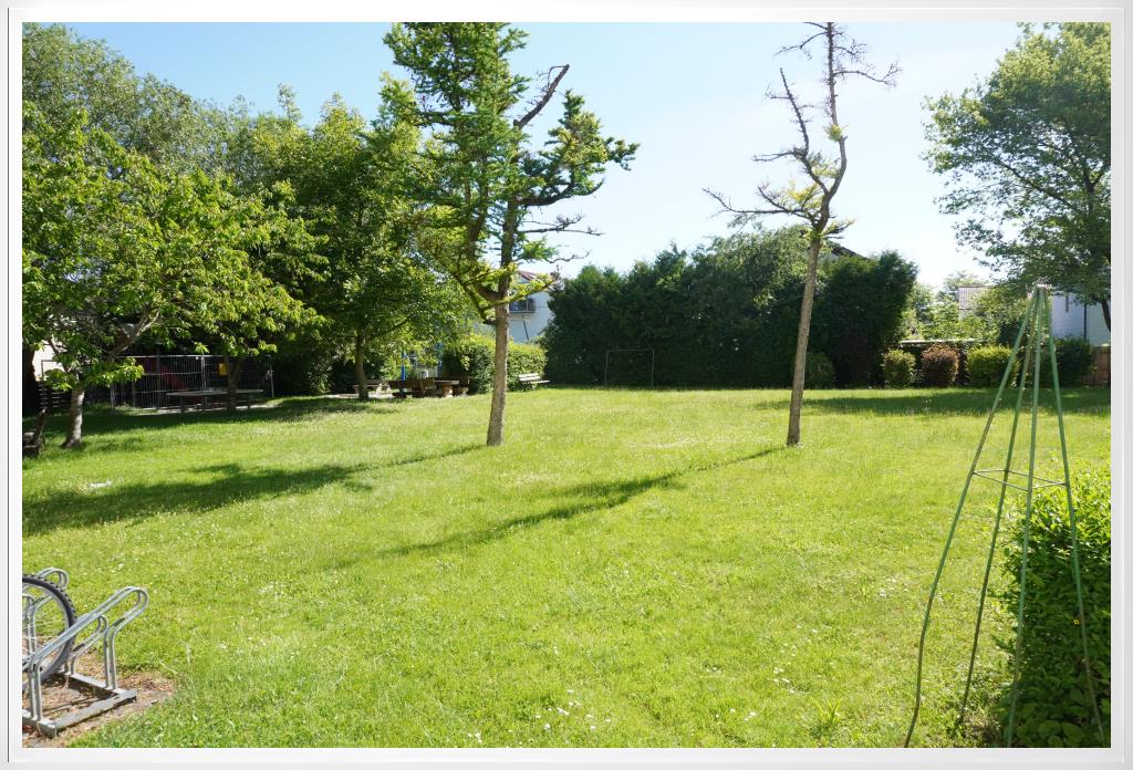 Der Garten ist ein Gemeinschaftsgarten mit Spielplatz, Tischtennisplatte und Sitzgelegenheiten.